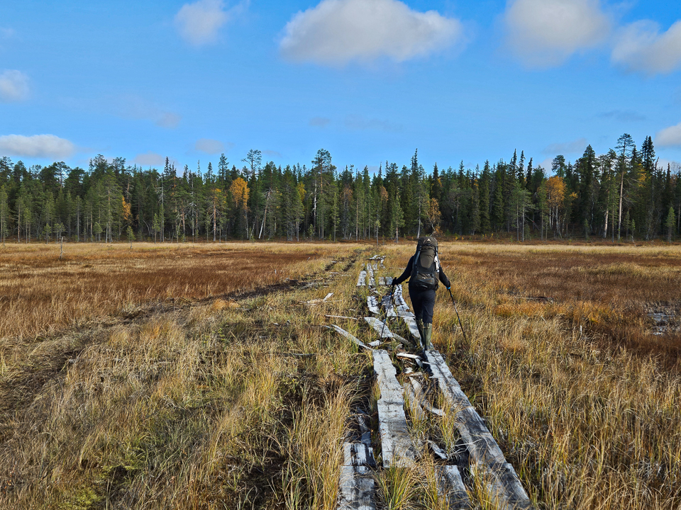 Kemihaarasta pohjoiseen on tehty uudet metalliritilät vanhojen lahonneiden pitkosten tilalle. Ne eivät osuneet lähinnä poluttomassa maastossa kulkeville reiteillemme. Itäkairassa on loputtomasti uppoavia pitkoksia ja häviäviä polkuja, soiden ja purojen ylityksiä. Tulen varmasti jatkossakin valitsemaan saappaat noille taipaleille.