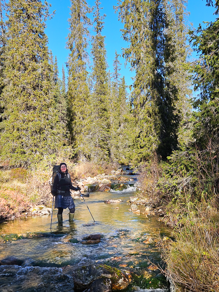 Vesi ei saa tulla varresta sisään kesken vaelluksen, koska reissun aikana kunnolla kuivaaminen ei onnistu. Woodstalkerin varsi ei jätä mitään pois vaan tulee lähelle polvitaivetta. Sujuvasti kahlasin läpi jokien ja märkienkin soiden. Muita kenkiä minulla ei ollut mukana. Yöksi nostin pohjalliset tuulettumaan ja saappaat olivat näin väljemmät ja hädän tullen nopeammat vetäistä jalkaan kuin päiväkäytössä.