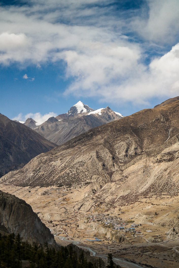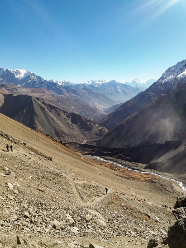 Fiilistelemme hetken maisemia, jonka jälkeen aloitamme itsekin matkamme alas. Matkaa Jomsomiin on vielä hyvä tovi taitettavana. Kilometrejä kertyy noin 15 ja laskua huimat 2500 metriä. Aloitamme jyrkän laskeutumisen.