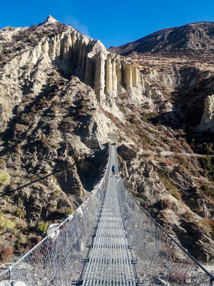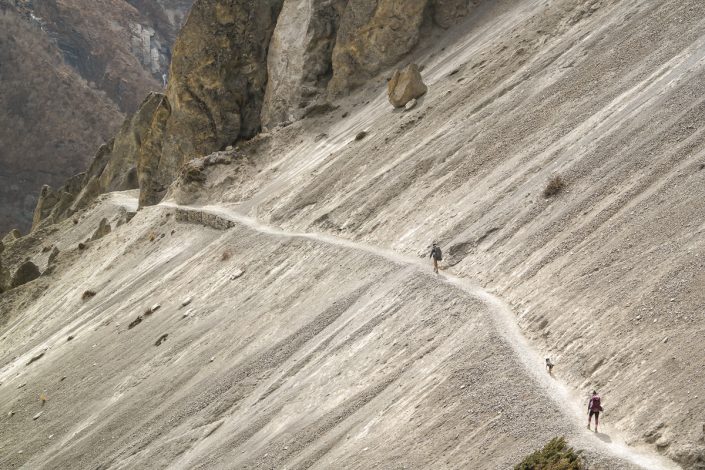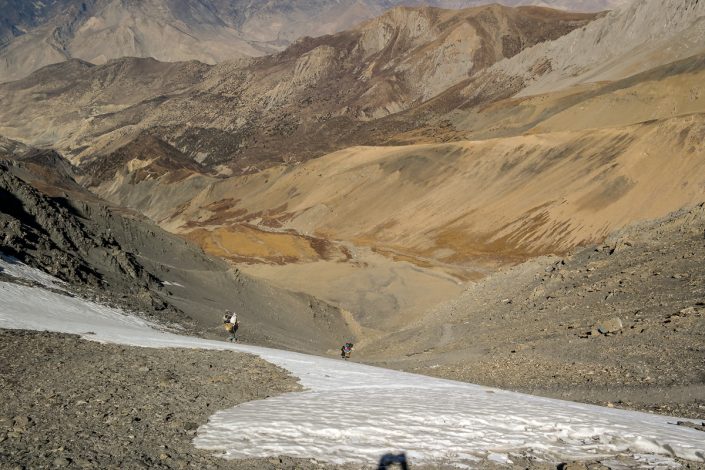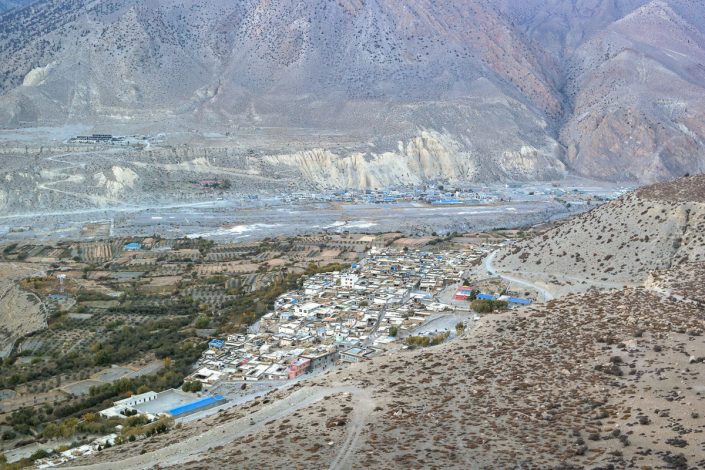 Alkujyrkän jälkeen reitti loivenee nopeasti, eikä vaaraa alamäkeen suistumiselle enää ole. On vain pitkä polku ja lopulta tie kaukana alhaalla odottavaan kylään. Ja tietenkin maisemat. Olemme nyt siirtyneet Mustangin alueen puolelle ja miljöö on kuivaa ja jylhää. Kaukana edessä lymyilee Dhaulagiri kumppaneineen ja alhaalla siintää karu hiekkainen jokilaakso. On hyvä, ettemme suunnitelleet telttayöpymisiä tälle puolen solaa, koska käytännössä koko matkalla Mesokantosta Jomsomiin ei löydy yhtään kunnollista vedenottopaikkaa. Kuten edellä jo todettu, seutu on hyvin kuivaa.