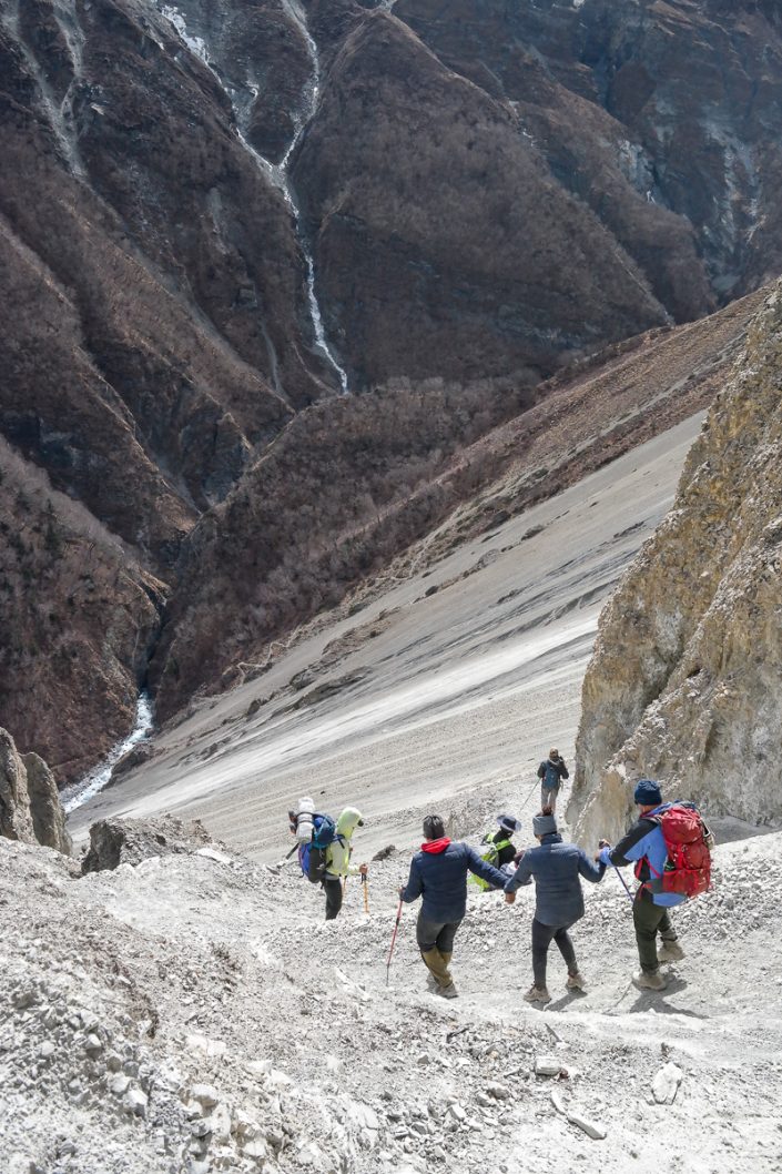 Mesokanto Lan ensimmäiset 300 metriä ovat hyvin jyrkää pientä sorapolkua. Vaeltajan on hyvä olla vireänä, koska polulla liukastuminen voisi johtaa usean sadan metrin syöksyyn alas kivistä rinnettä. Jos polku olisi jään tai lumen peitossa, voisi tämä osuus olla siis suhteellisen vaarallinen. Jonkinlaiset jääraudat ja sauvat olisivat ainakin vähimmäisvarusteita, jotka olisi hyvä olla mukana. Nyt polku on kuitenkin onneksi jäästä ja lumesta vapaa ja laskeutuminen on helppoa, vaikkakin tarkkaavaisuutta vaativaa. Ei siis ongelmia. Manangista ostamamme kevyet jääraudat saavat jäädä reppuun.