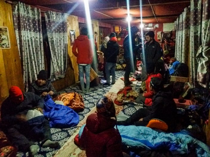 Lopulta pöytätilaa kuitenkin järjestyy ja saamme sovittua majatalon isännän kanssa, että nukkuisimme ruokasalin lattialla seuraavan yön. Emmekä ole ainoita. Päivällällisen jälkeen isäntä ohjeistaa porukan ja yhteisvoimin kannamme ruokasalista pihalle kaikki tuolit sekä pöydät. Tämän jälkeen levitetään lattialle ohuet viltit alustoiksi ja käymme kaikki nukkumaan tiiviiseen siskonpetiin. Onneksi meillä on omat makuualustat kannossa, ne ovat huomattava mukavuustekijä ja ilman niitä yöstä voisi tulla paljon kylmempi. Hyvä kokemus tämäkin. Ei muuta kuin korvatulpat korviin ja unta palloon. Seuraava päivä tulisi olemaan pitkä.