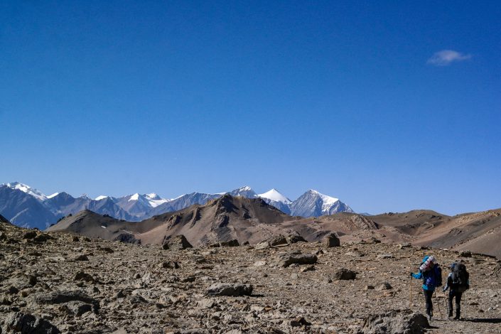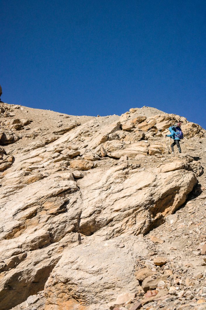 Solassa tuulee ja pysähtyessä varjossa alkaa palella. Emme siis pidä ylhäällä sen pidempiä taukoja, vaan suuntaamme samantien eteenpäin. Päivä on jo pitkällä ja haluamme päästä leiriin hyvissä ajoin ennen pimeää.