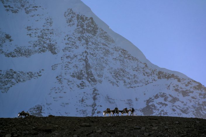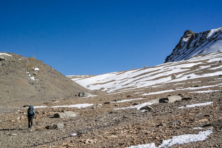 Tämä osuus on hyvin erämainen: ei mitään merkkejä ihmisen asutuksesta missään. Vain karua ylänköä ja korkeita huippuja silmän kantamattomiin. Tästä johtuva autiuden tunne saa omat suupieleni nousemaan hymyyn ja tunnen kuinka alan rentoutua. Kaukana edessä näemme nyt ensi kertaa myös  kolmannen jättiläisen, jonka ympäri tarkoituksemme on kävellä; Dhaulagiri nousee ympäristöään korkeammalle ylväänä valkoisena kartiona ja näyttää niin kauniilta alkuillan auringossa.
