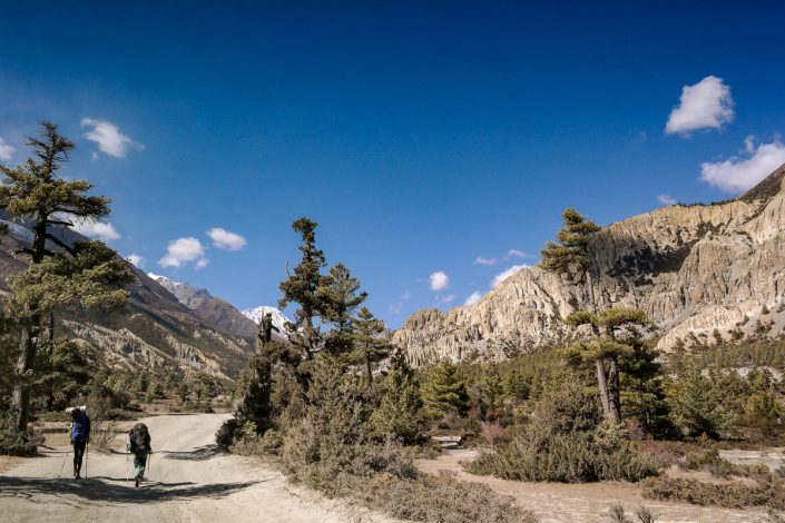 Toisinaan polku myös onneksi sukeltaa metsän suojiin pois tieltä ja meno muuttuu rauhallisemmaksi. Myös tahtimme on rauhallisen verkkainen. Manaslun jälkeen, ja ennen edessä olevia rankempia osuuksia, olemme ajatelleet ottaa rennosti ja kerätä voimia matkalla Dharapanista alueen isoimpaan kylään Manangiin. Matka kestää käytännössä kolme ja puoli päivää rauhallisesti kävellen ja jo valmiiksi akklimatisoituneet kehomme kulkevat tämän osuuden kevyesti.