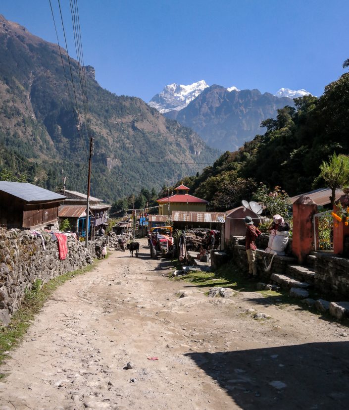 Ero äsken kierrettyyn Manasluun on selvä heti alkumetreiltä lähtien. Ihmisiä on liikkeellä paljon enemmän ja polun, tai tässä vaiheessa tien, varret ovat paljon tiheämmin rakennettuja: majataloja ja teetupia tulee vastaan hyvinkin tiuhaan. Siinä missä Manaslu Circuit oli pääasiassa rauhallista vuoristopolkua, joutuu Annanpurnaa kiertäessä alkumatkasta kävelemään usean pätkän myös hiekkatietä pitkin. Välillä ohi pyyhkäisee autoja, välillä taas moottoripyöräseurueita.
