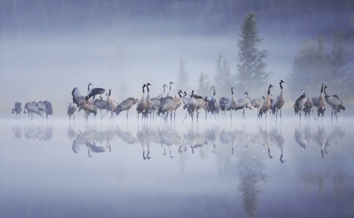 “Maaginen kuva kurkien yöpymispaikalta. Kuva on yhtä aikaa lintukuva ja maisemakuva, johon kuvaaja on vanginnut vahvan ja rauhallisen tunnelman tasapainoisella ja hallitulla sommittelulla. Usva irrottaa kurjet maisemasta ja tavallaan kehystää ne, mikä tuo kuvaan sadunomaisuutta. Heijastukset korostavat tunnelmaa. Kuva kertoo myös lintujen käyttäytymisestä – arkinen höyhenien sukiminen yöpymispaikalla on harvemmin kuvattu tilanne kuin päiväsaikaan pelloilla viljan tankkaaminen.”