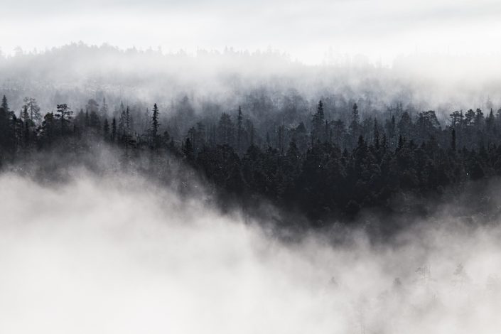 “Poikkeuksellisen kouriintuntuva usva. Synkkä tumma metsä terävine havupuineen ja vaalean sumun pyöreät muodot luovat vahvan kontrastin. Sumu vyöryy, kieppuu ja tuntuu jopa uhkaavalta, erittäin vahva tunnelma.”