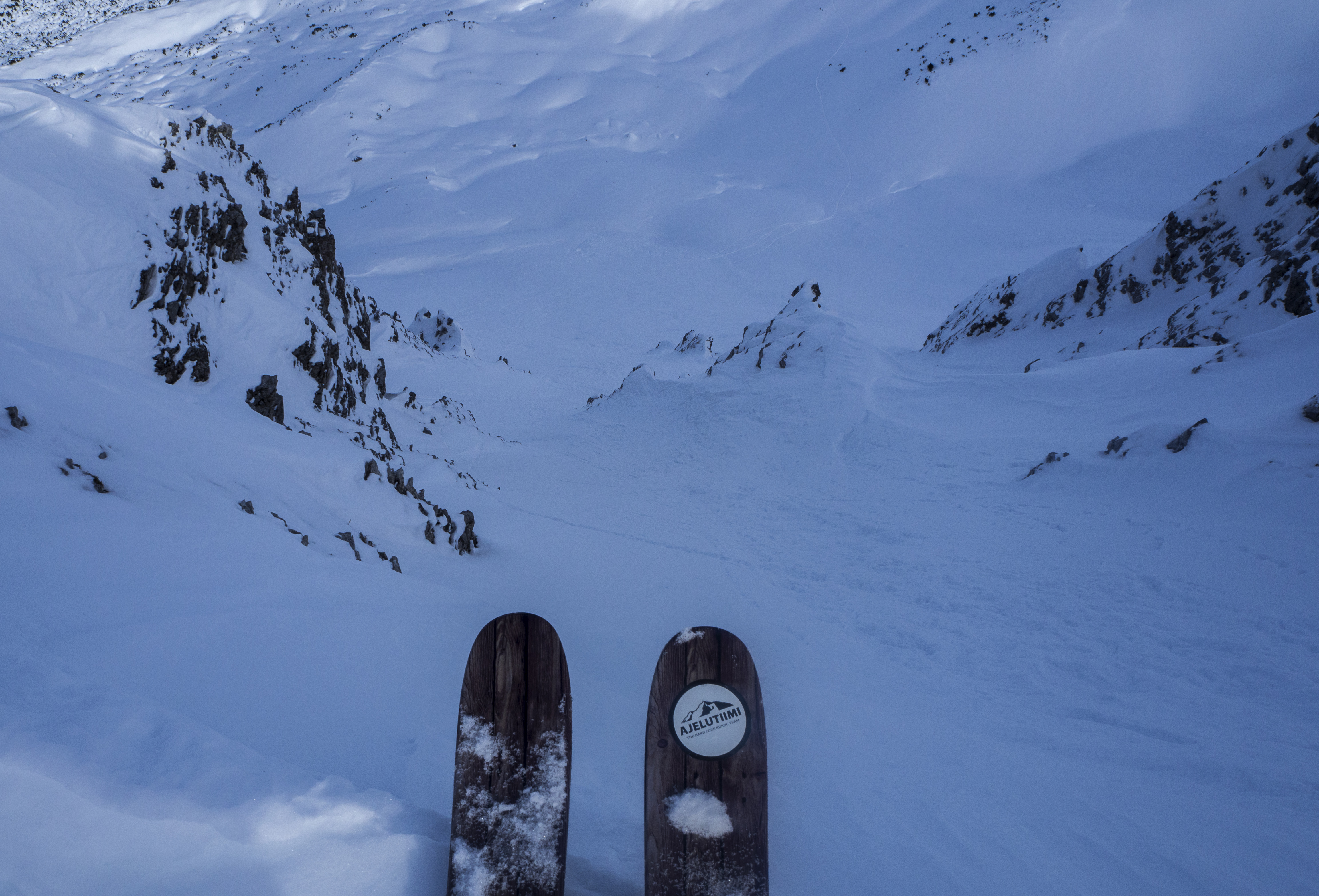Tämän kauden olen hiihtänyt Armadan suksilla. Randolle otan yleensä mukaan Kufo 108:n. Kufo kelluu mukavasti pyydarandolla ja taipuu näppärästi kurulaisiin.  Jos kurkataan verkkokauppamme puolelle, niin hyviksi vaihtoehdoiksi voisin heittää esimerkiksi Black Crowsin Navis Freebirdin tai Black Diamondin Link 105:n. Molemmat sukset kestävät hyvin vauhtia sekä ovat painonsa puolesta sopivat randolle.  Lasken itse telluilla, joten valintani siteeksi on jo useana vuotena ollut Rottefellan Freedom. Randokäyttöön suunniteltu Freedom kestää hyvin vauhtia. Se on kevyempi painoltaan kuin Rottafellan jämäkämpi Freeride-side. Viime vuodet olen käyttänyt sekä Black Diamondin että Kohlan skinejä. Skineiksi loistava valinta on esimerkiksi Black Diamodin Glidelite Mohair. Lisäksi tourista riippuen heitän reppuuni jääraudat ja hakun – harvoin niille tulee käyttöä, mutta afterissa niitä on aina mukava esitellä.