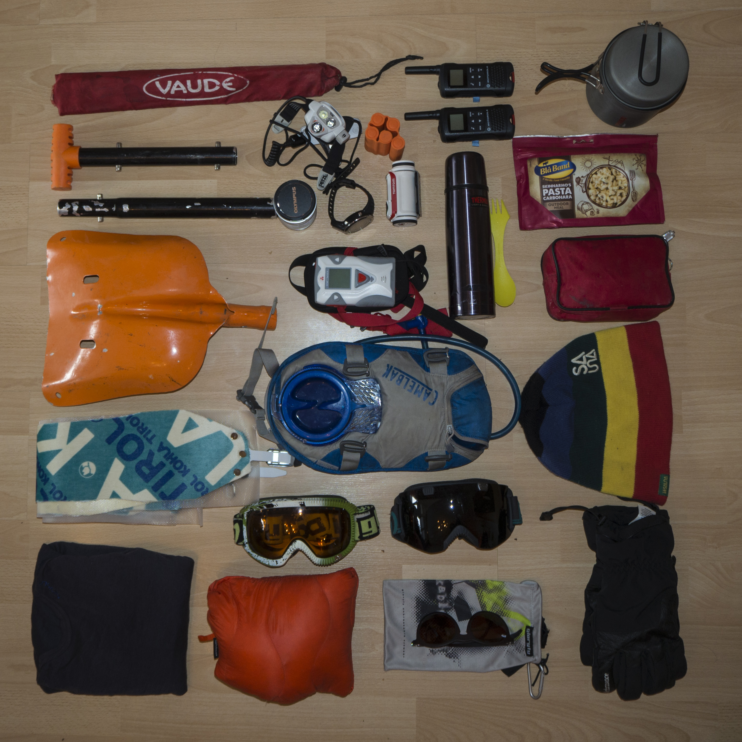 Päivän tourilla repusta löytyy lumivyörykamat, skinit, ea-kamat, kevytuntsikka, vaihtopaita, vaihtohanskat, laskulaseja, Gloryfyn kaiken kestävät aurinkolasit,  Leatherman Wave, Petzl Nao 2, termospullo, Camelbak, radiopuhelimet, kypäräkamera sekä ranteesta Suunton Ambit 3 Peak. Välillä tourilla on mukava herkutella ja tehdä lounasta, joten mukaan on tullut napattua Primuksen keitin ja kattila.