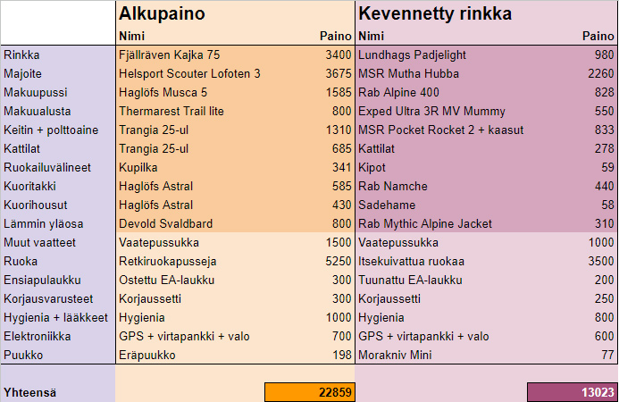 Tee lista varusteistasi. Löydät ilmaisia taulukkolaskentaohjelmia tai voit etsiä tähän tarkoitukseen tehtyjä sivuja netistä. Punnitse varusteitasi ja katso, mitä vaihtoehtoja sinulla on. Esimerkiksi vaatteissa voit säästää paljon painoa huolellisella suunnittelulla. Varusteiden punnitus yleensä yllättää kovasti ja laittaa miettimään asioita uusiksi.