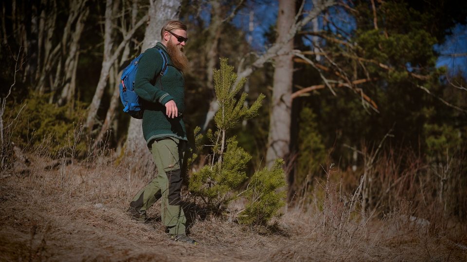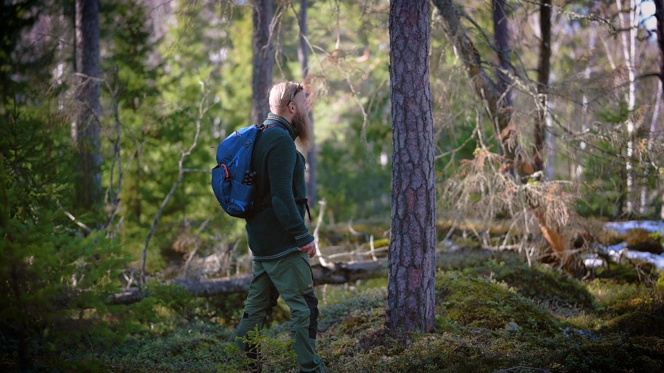 Tällä kertaa lähdimme päiväretkelle ja Cajlla on selässään 26-litrainen päiväreppu, Osprey Hikelite 26. Yleensä n. 25-30-litraiseen reppuun mahtuu päiväretkellä tarvitsemat varusteet ja taukovaatteet.
