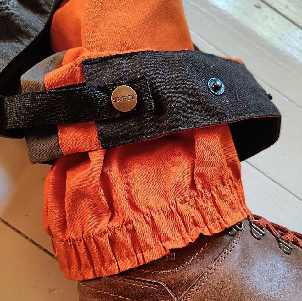 Saatavilla oli vain oranssi väri, josta tosin pidän suuresti. Oranssi väri tuo näkyvyyttä, mikä on turvallisuusasia. Takamuksessa ja edessä on tummempaa kangasta, mikä on hyvä, koska oranssissa näkyy lika äkkiä. Lahkeissa on alhaalla vielä vahvikekangasta, joka tuo kestävyyttä kun jalat hinkkaavat yhteen. Nämä housut kestävät kyllä todella pitkään, rajuakin käyttöä.