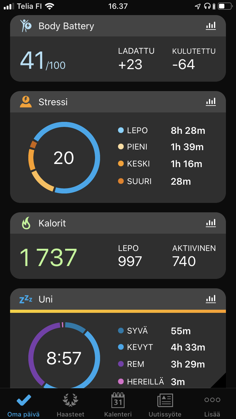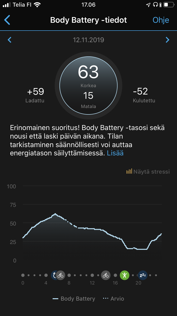 Aika hyvin ominaisuus kyllä ”energiatason” ja ”latautumisen” kertoo, ja vointia myötäilee. Body Battery- arvo ilmoitetaan asteikolla 0-100, kuinka paljon on sillä hetkellä kulutettu ja/tai ladattu. Aamulla lukema on luonnollisesti korkeampi kuin illalla, yön aikana ”latautuu” ja kaikenlainen fyysinen rasite sitä ”kuluttaa”.