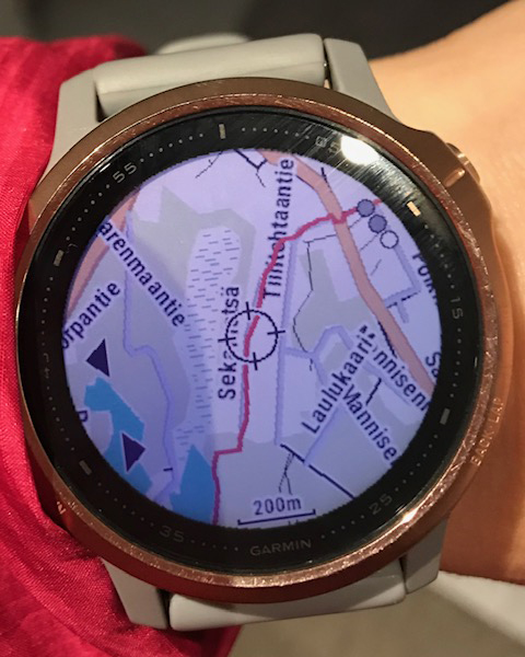 Maantiepyöräilylenkillä testasin hieman kellon karttaominaisuuksia. Tein täysin vieraassa ympäristössä lenkin, jonka puolivälissä merkitsin kellon kartalla päätepisteen. Pisteen määrittäminen oli helppoa: yksinkertaista suurentaa ja pienentää karttaa, liikkua jokaiseen ilmansuuntaan. Karttanäytön sai riittävän suureksi, jotta näytöllä näkyivät kadut ja tiet (Kellon näytön mukaan 5 metrin tarkkuus).