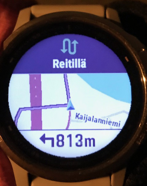 Päätepisteen määritettyäni lähdin ajamaan, ja mitä ihmettä, kello opasti ääni- ja värinähälytyksin sekä kellon näytön visuaalisin kuvauksin perille! Mikäli en ajanut kellon suunnittelemaa reittiä, se haki lähes välittömästi uuden reitin päätepisteeseen. Kokonaisuudessaan Garmin hakee nopeasti GPS:n suorituksen alettua. Vielä en testannut valmiin, ladatun reitin käyttöä. Tämä ominaisuus kiinnostaa kovasti, ja mikäli osoittautuu toimivaksi, varmasti tulen käyttämään.
