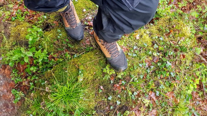 Kukkien väriloisto reitillä huokui vielä poissaolollaan, mutta onneksi keväinen metsä muutoin tulvi kaikista suunnista valloittavaa vihreää. Luonto oli vasta nuoressa hehkussaan ja siksi vaaleanvihreä runsaus oli huumaannuttava. Reitti oli vivahteikas ja kaunis, vettä satoi vaihtelevasti tihuttaen tai kaatamalla, mutta kenkä selvisi testistä moitteitta. Jopa pieni (tahaton) sivuaskel joen uomalta veteen asti ei saanut kenkää sisältäpäin märäksi – naurusta silmäkulmat sen sijaan kyllä. Haglöfsin sivut lupailevatkin kengän vedenkestävyyden aina 100,000 askeleeseen asti, ja vaikka sinne asti ei testi kerralla yltänyt, mittareiden näyttämät retkipäivän 30,000 askelta sai toteuttaa kuivin jaloin, olosuhteista huolimatta.