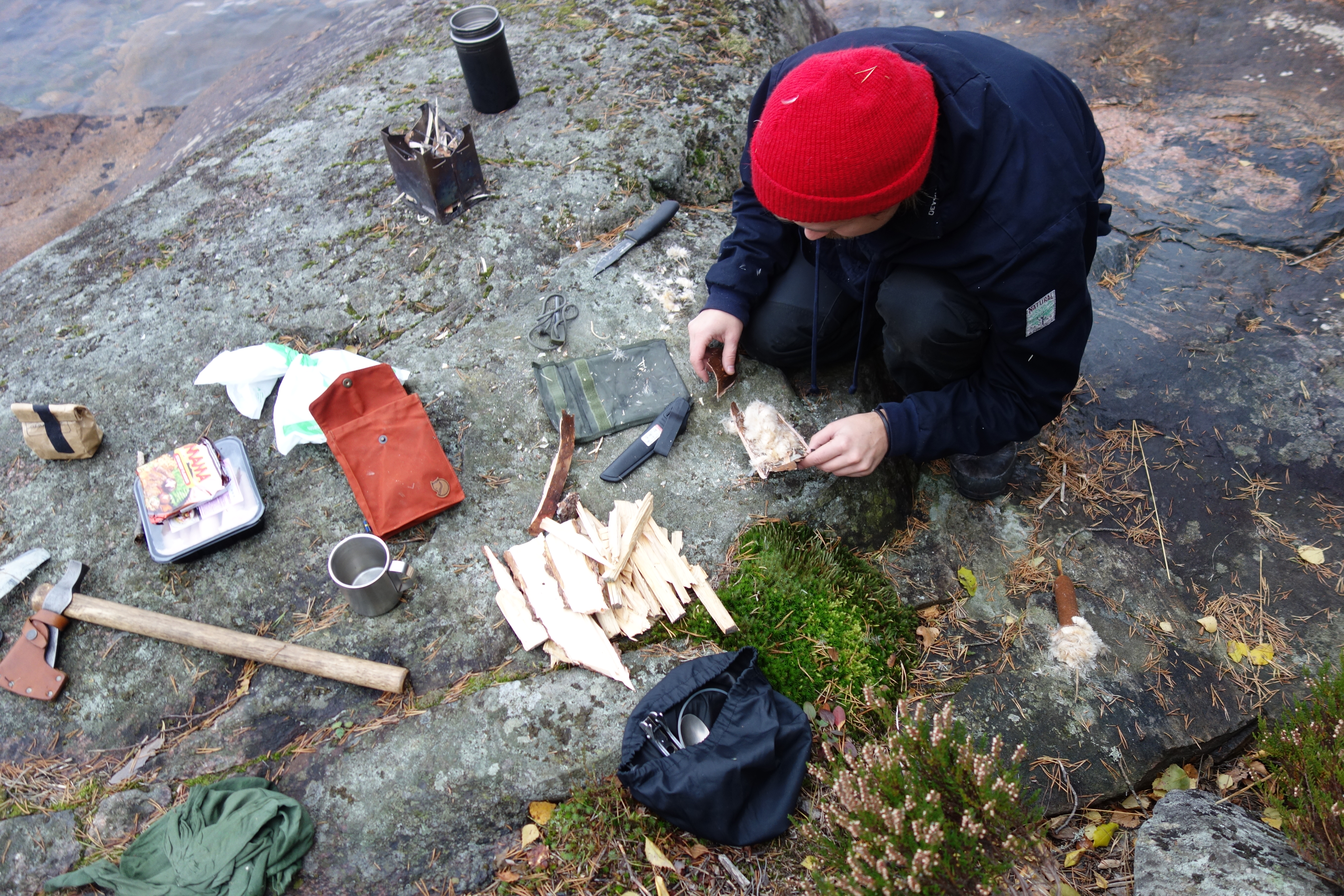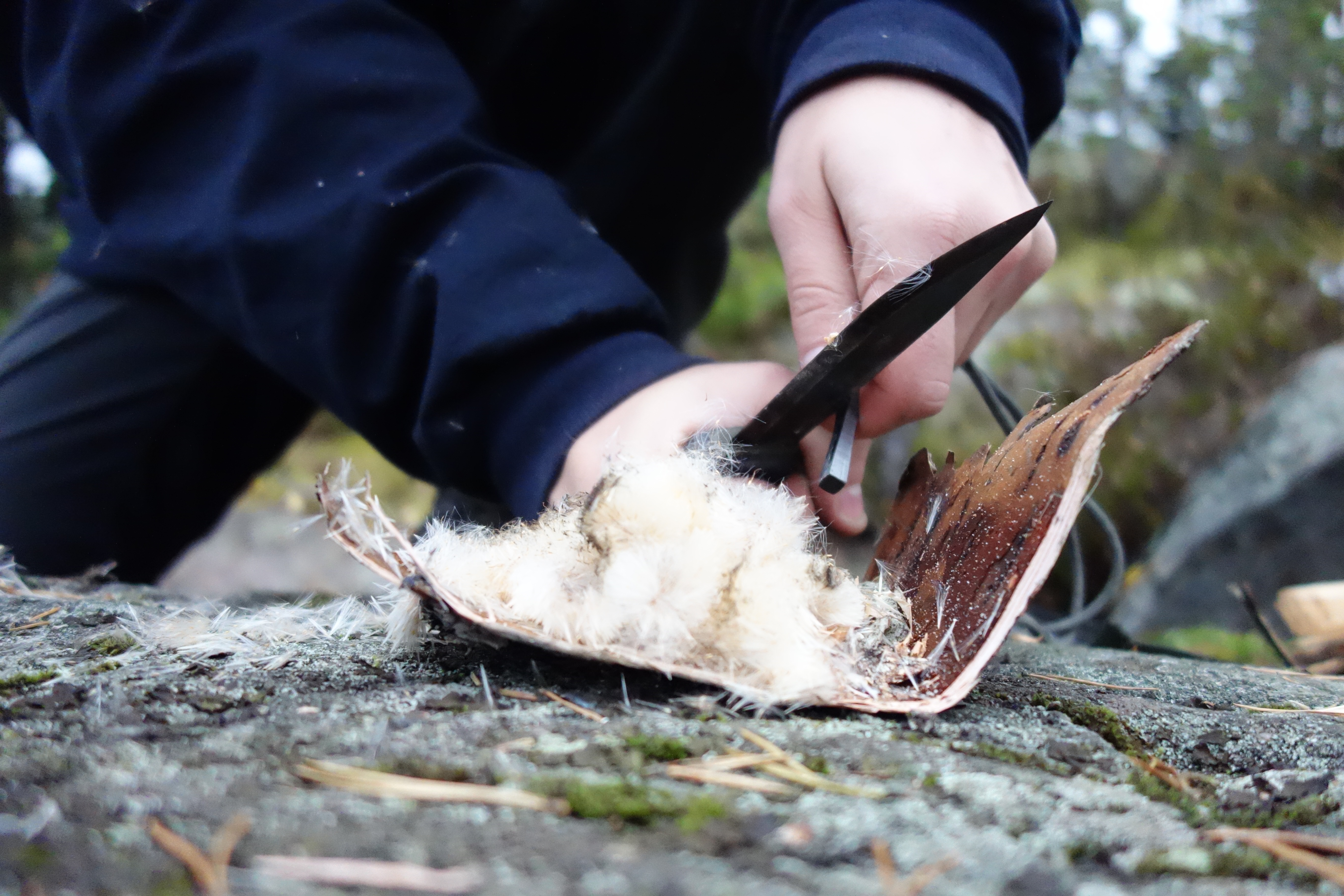 Helpoin tapa alkuun on varata retkelle mukaan pumpulia, joka syttyy tulusten kipinästä iloisesti. Yläpuolella olevassa kuvassa on avattu osmankäämi, joka viimeksi toimi sytykkeenä. Suosittelen etsimään koivun tuohta ja repimään siitä ohkaisia lastuja, koska ne syttyvät hyvin sytytyksessä. Sytytysasetelma on itselläni melkein aina sellainen, että etsin kaatuneesta koivusta ison tuohilevyn. Sen päälle laitan esim. pumpulia tai raavin puukolla koivunkaarnapölyä siihen keoksi. Mikäli saatavana on pihkaa, ripottelen sitä sytykkeen joukkoon, koska se palaa hyvin ja pitkään. On hyvä olla valmiina pieniä tuohisuikaleita kun tuohipöly tai pumpuli syttyy on siihen saatava pitkään palavaa materiaalia mahdollisiman äkkiä.