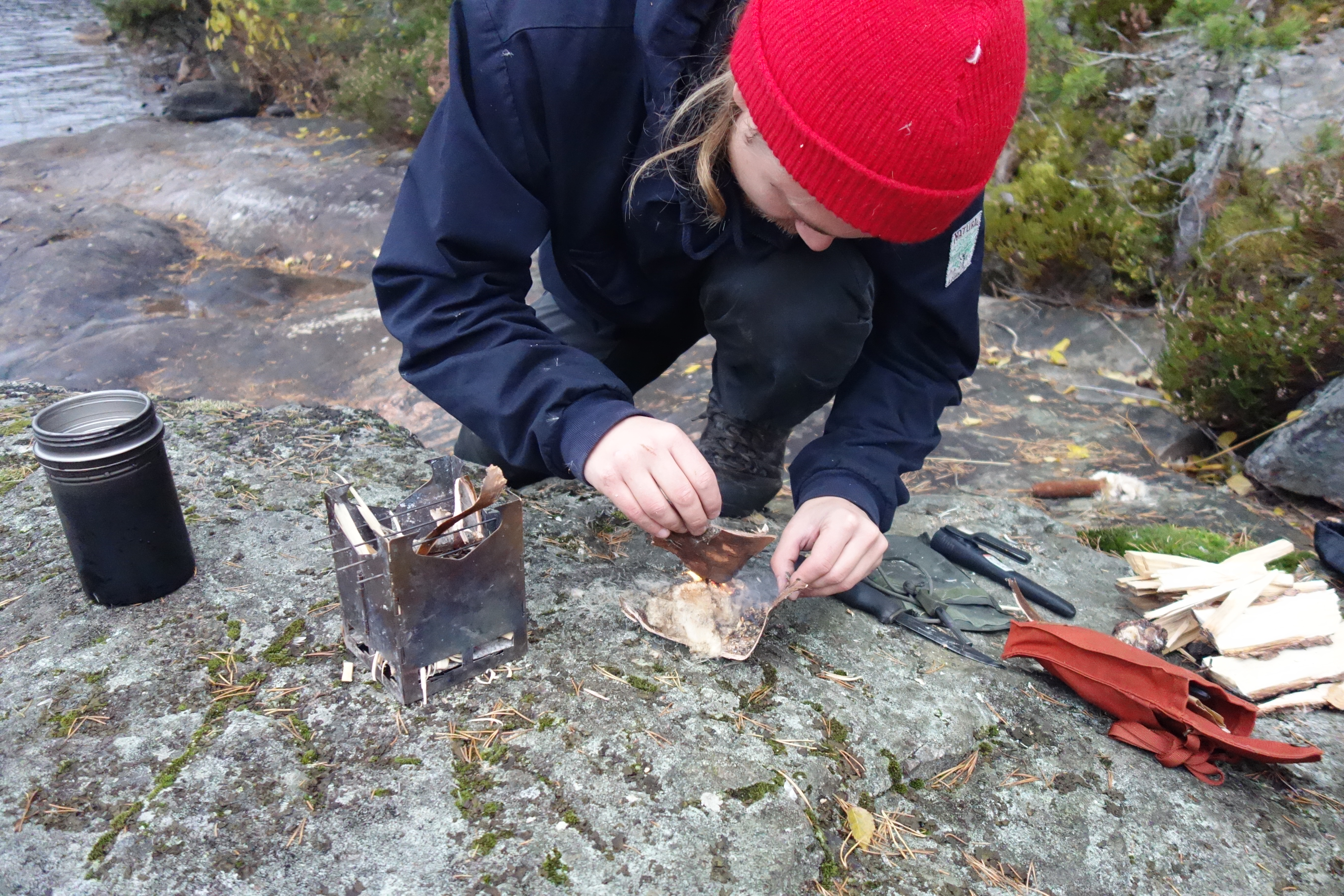 Nyt kun kipinä on saatu aikaan ja sytykemateriaali palaa, on oltava ripeä ja sytyttää tuohesta revityt suikaleet, jotka toimivat “tulitikkuina” kun tuluksilla aikaansaatu tuli siirretään itse nuotioon. Alemmassa kuvassa siirrän tulen Küntzi risukeittimeen.