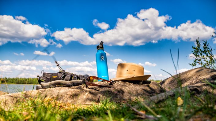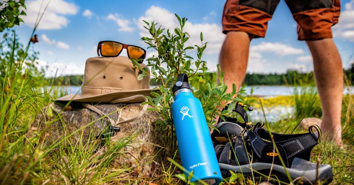 Kuvassa Jack Wolfskin El Dorado Hat hattu, Gloryfyn G14 Contour Polarized aurinkolasit, Hydro Flaskin 21 Oz Standard Flex Cap termosjuomapullo  ja Keenin Newport H2 –sandaalit.