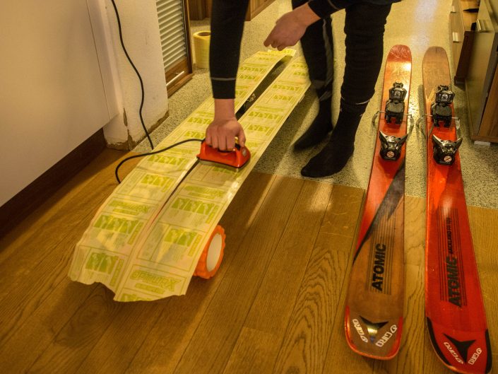 Suuremmat korjaukset ja siteiden asennukset olen teettänyt keskusten ala-asemilla, joiden hinnat ovat kohtuulliset ja ammattitaito kohdillaan. Itse teen lähinnä suksen voitelut ja se onnistuu omassa keittiössä Optiwaxin luistonauhalla. Homma toimii yksinkertaisuudessaan niin, että kiinnitetään luistonauha sukseen kärkeen koko matkalle ja painetaan rautaa kevyesti suksen päällä olevaa nauhaa vasten. Raudalla lämmitetään nauha suksen kärjestä kantaan ja sitten irroitetaan nauha pohjasta heti silityksen jälkeen. Lopuksi sukset harjataan ulkona.