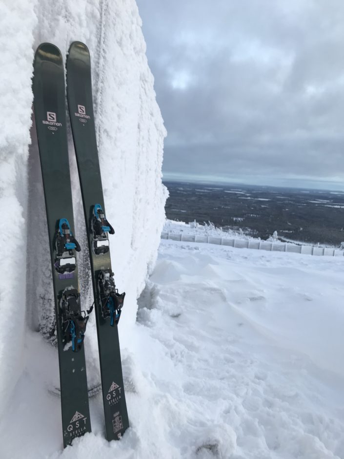 Tänä talvena mulla on alla Salomonin QST 106 sukset, 172 cm mitassa. Super hyvät! Oma mitta melkein 160cm. The QST 1o6 skis from Salomon have been so good to ride.