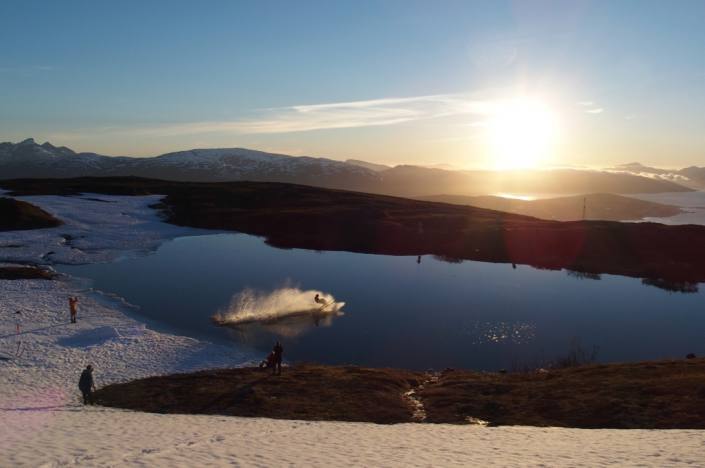 Vesihiihtoa Fløyan päällä, venäläinen telttasauna rannalla ja Kvaløya taustalla. Pond skimming on Fløya, russian tent sauna getting warm and Kvaløya behind. P: Magnus Werner