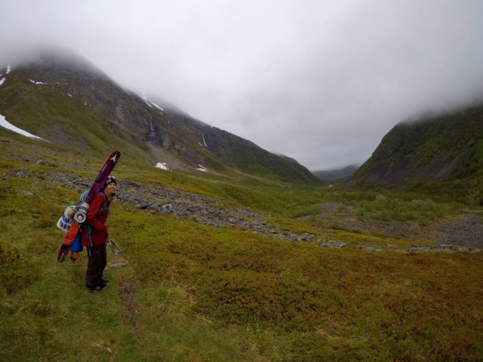 Lyngenistä löytyy varmasti toista upeampia kesälaskupaikkoja, mutta kesäkuun puolenvälin jälkeen alkavat lähestymiset olla kengillä jo aika pitkiä. Meillä oli tavoitteena tehdä jo perinteeksi muodostunut pe-la välisen yön touri tällä kertaa ylös Daltindenille, joka on 1533m korkea huippu Lyngenin eteläsaarella Furuflatenin lähellä. Mukaan pakattiin teltta, sillä kävely lumirajalle vie n. 2-3 tuntia, niin että olisi nukkumapaikka lähempänä takaisin tullessa. Raskasta hommaa kantaa kaikki lasku-ja telttailukamat selässä, mutta paikan päällä palkitsee. Sääennuste lupasi täyttä aurinkoa yöksi, mutta sankka sumusadepilvi piiritti vuorta tiukasti koko yön. Päästiin ylös lumirajalle, skinnattiin n. 200m ja käännyttiin takaisin totaalisen sinkin takia. Teltassa hyvät yöunet ja seuraavana iltapäivänä patikointi takaisin autolle. Ja totta kai juuri silloin sumukin hälveni ja nähtiin kauempaa mitä olisi ollut tarjolla 😀