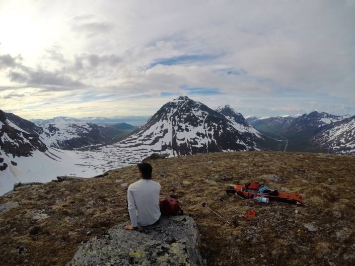 Tromsø fastland means the inland area next to the city and has many good peaks as well for summer ski touring. So far we have checked Storfjellet, Fagerfjellet, Tromsdalstinden and Andersdaltinden. Storfjellet offered some really nice touring in shorts, and almost being flushed away with a river that got half a meter deeper during the day haha. Tromsdalstinden is one of the classical hikes here and offers a really nice view over the city of Tromsø and a lot further. There are many options to go up, but the shortest way is from behind the mountain, from a place called Nordbotn. There’s even a parking place where to leave your car and the trail starts straight from there. Andersdalstinden is for sure one of the mountains that has a lowest snow level at the moment, around midsummer it was only about 200m from the road. We made a wrong choice with the way up and choose to skin/bootpack on the ridge that is a popular way up in the winter time. This time there was not that much snow left and it was more like climbing between big loose rocks. We turned back since everything was feeling so unstable, all the rocks, the wet ground under and our state after all the midsummer partying the night before..:D But it’s a beautiful place and the mountain next to it, Sultindan,still has some skiable couloirs.