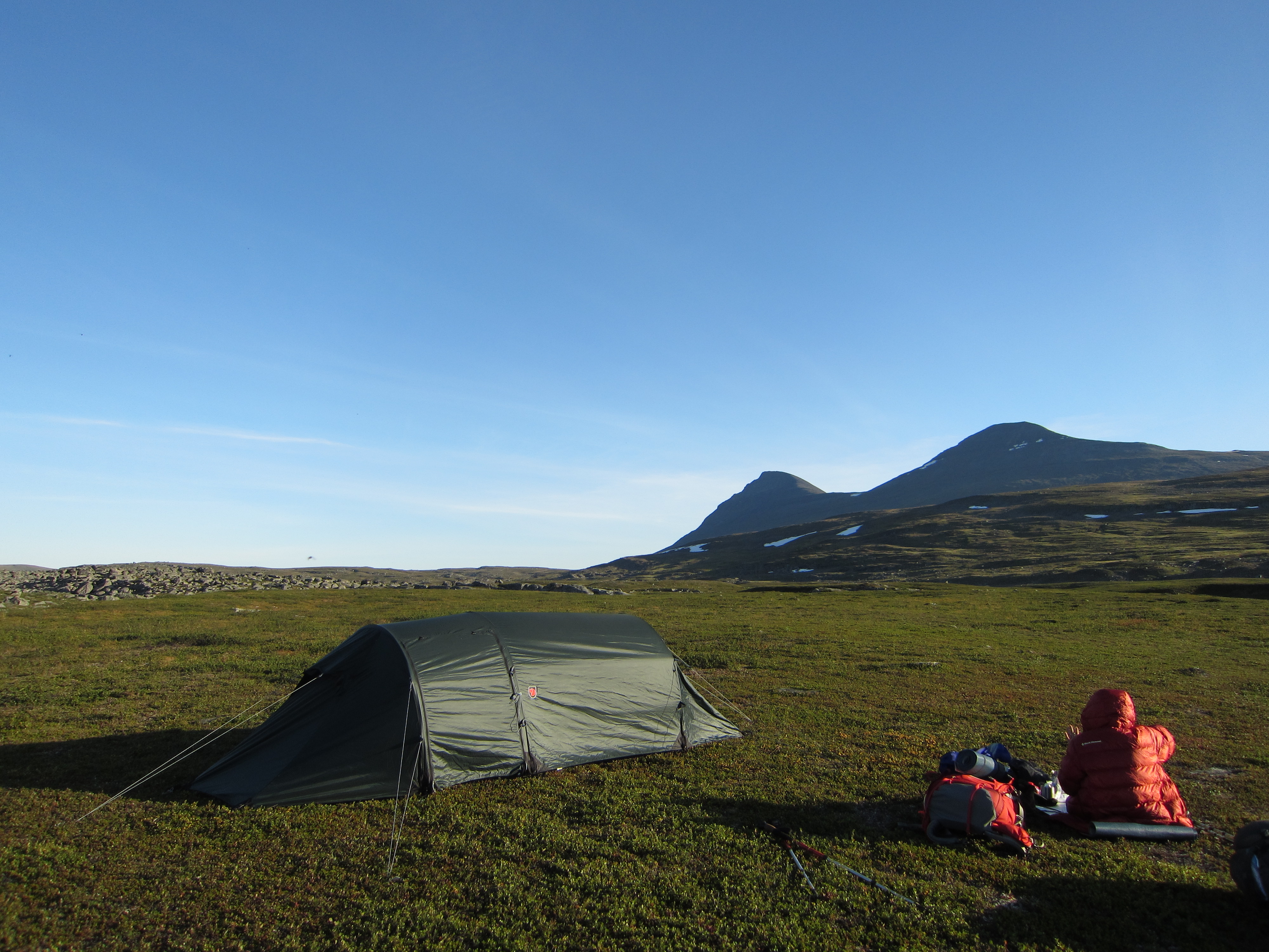 Viimein tulimme leiripaikalle illalla. Emme ole ikinä pystyttänyt telttaa sellaisella vauhdilla kuin tuona iltana. Hyttysiä oli niin paljon, että emme voineet odottaa sekuntiakaan, vaan suoja oli saatava kasaan ja äkkiä. Nälkä väänsi vatsaa solmulle ja energiat olivat lopussa. Loppu hyvin kaikki hyvin. Nuo inisevät tappajahyönteiset jäivät teltan hyttysverkon ulkopuolelle kun kokkasimme Blå Bandia telttamme eteisessä. Ihastelimme illan auringonlaskua ja painuimme pehkuihin.