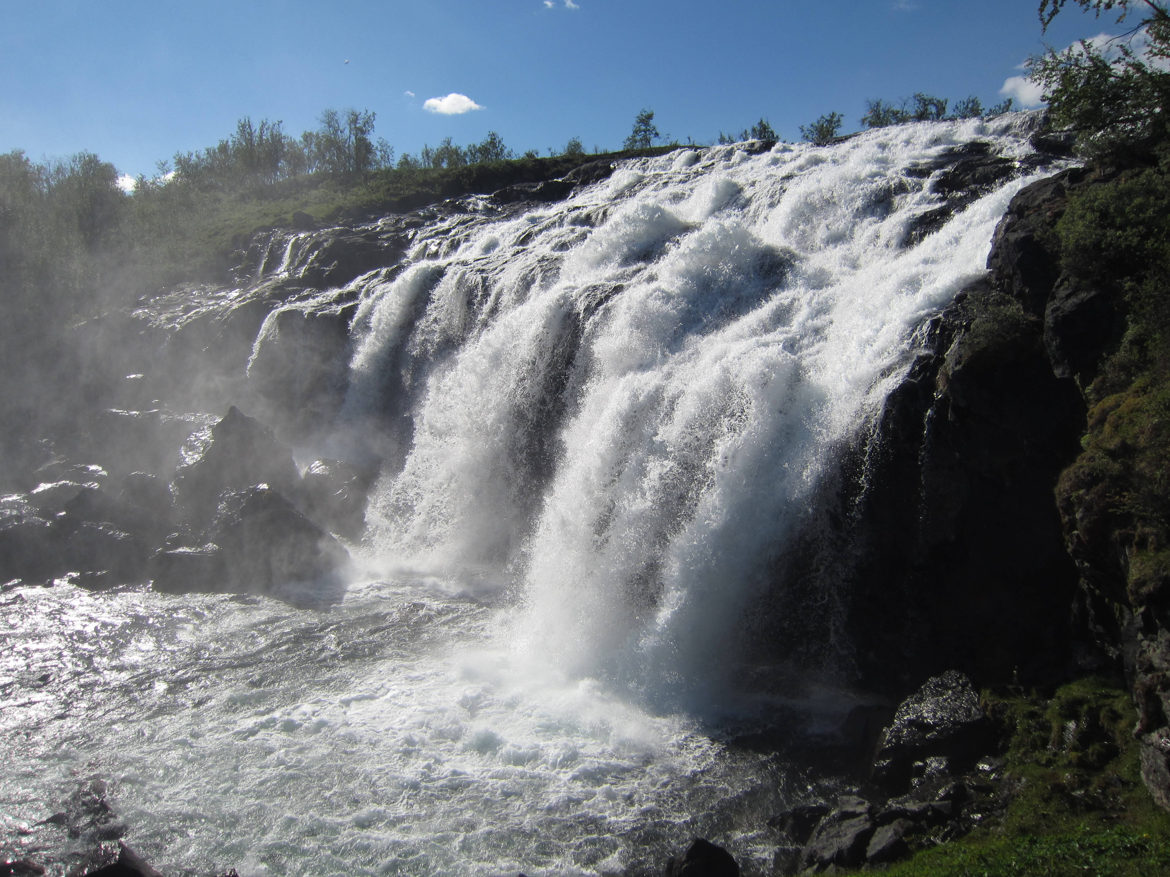 Saavuimme iltapäivällä Pältsastuganille ja jätimme rinkat tuvan seinää vasten odottamaan kun menisimme katsomaan vesiputousta. Huhun mukaan Pältsastugania isännöi vanha rouva nimeltään Vera n.70v, mutta hän pysyi visusti omassa majassaan emmekä siis päässeet jututtamaan häntä. Liekkö tämä huhu piti paikkaansa, se jäi meiltä selvittämättä. Vesiputous oli puolestaan vaikuttava. Se vyöryi alas jyrkänteeltä ja sai olon tuntumaan hyvin pieneksi. Vesimassasta nousi raikas vesihöyry, joka virkisti kasvojen palanutta ihoa.