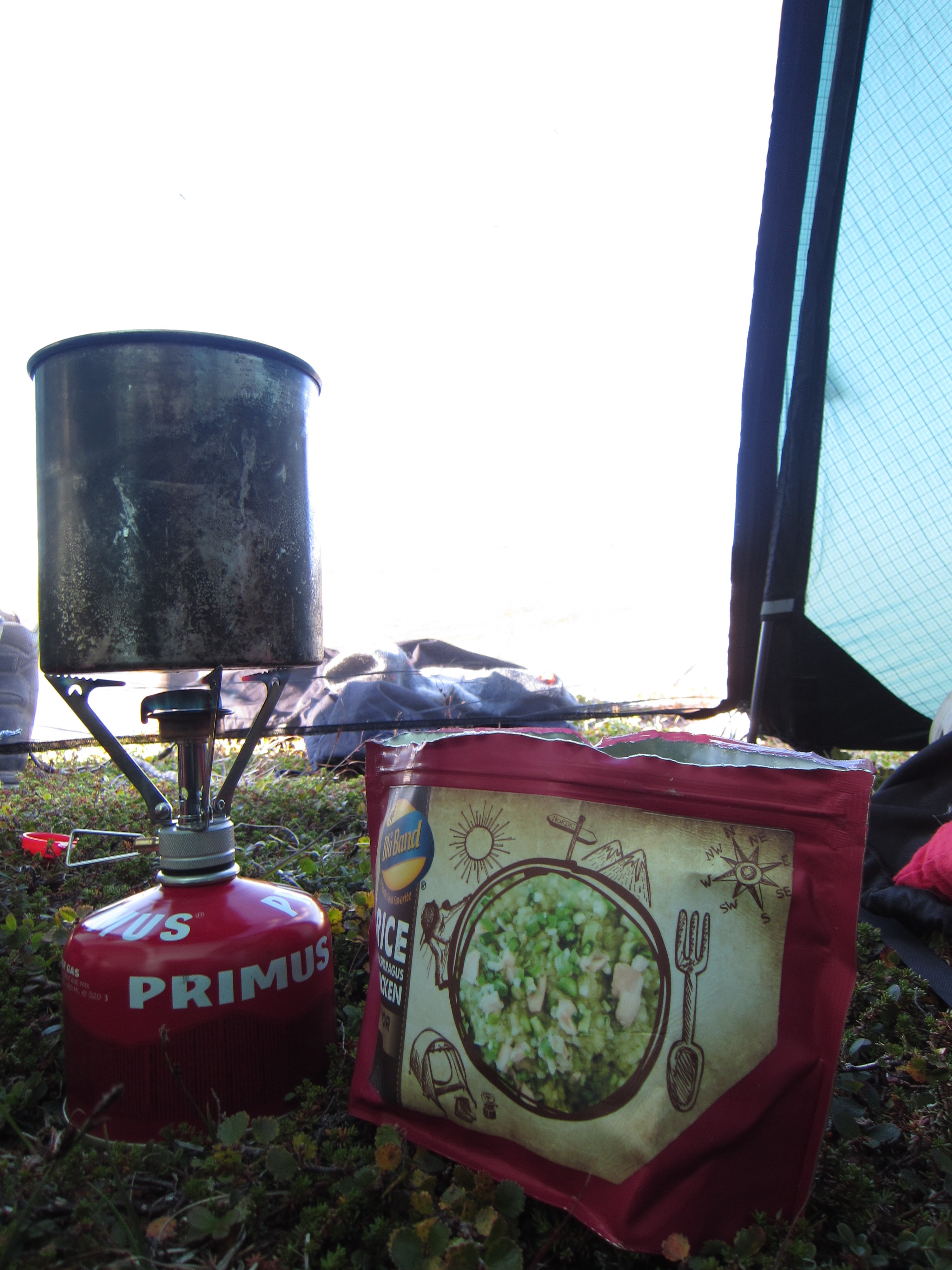 Ilta oli kääntynyt oikeastaan jo yöksi kun saavuimme kolmen valtakunnan rajapyykin vieressä sijaitsevalle leiripaikalle. Autiotupa oli tietenkin ääriä myöten täynnä väsyneitä vaeltajia, joten pystytimme mukisematta oman viidentähden hotellimme, eli Fjällrävenin Akka 2 teltan lähettyville. Nopeat kokkaukset kaasukeittimellä samalla kun miljoonapäinen hyttysarmeija yritti tikata meitä hengiltä. Julistimme pussiruokadieetin alkaneeksi nautiskelemalla Blå Bandin Oriental Chickeniä. Sitten makuupussiin ja huomenna vasta alkaisi se varsinainen koitos.