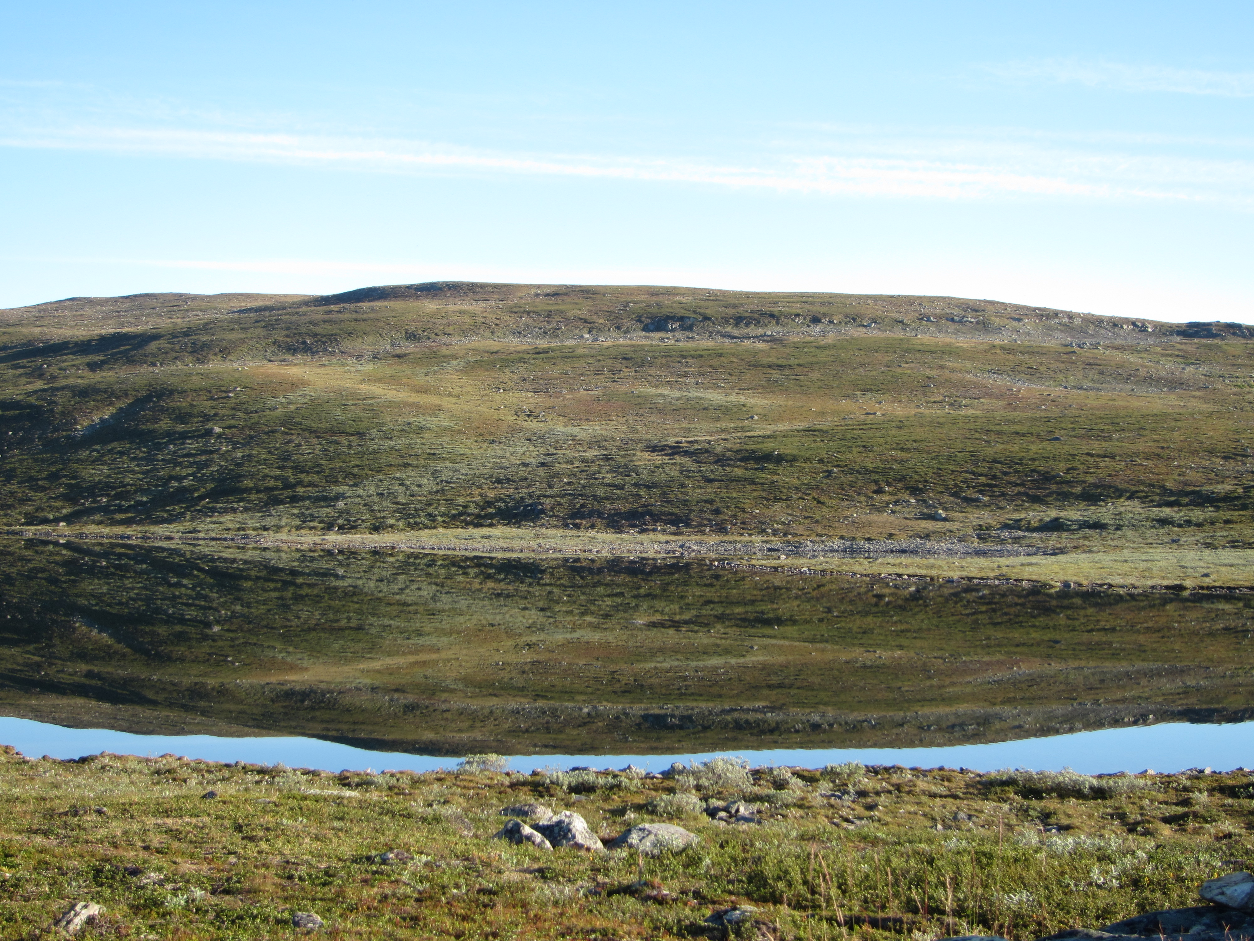 Viimeisen vaelluspäivän aamuna luonto tarjoili meille taas parastaan. Telttamme edustalla oleva järvi oli niin peilityyni, että tunturit vääristyivät sen pintaan ja unenpöpperössä piti hieraista pari kertaa silmiä ennenkuin ymmärsi miten päin teltan ovella oltiin.