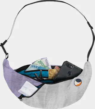 Ekologinen ja eettisesti valmistettu vyö-/olkalaukku.
