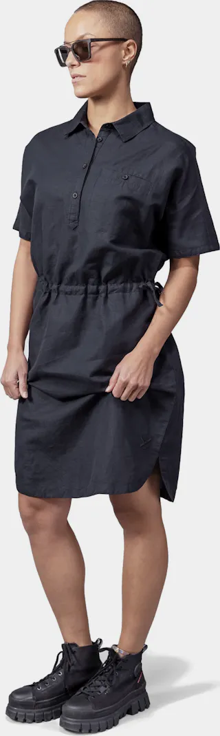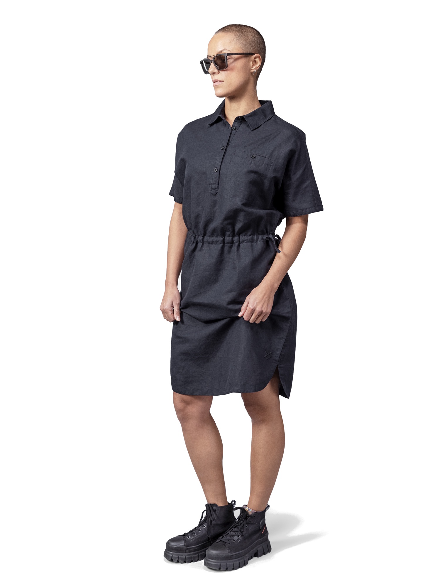 Kauniisti laskeutuva naisten mekko, materiaalina tekninen mutta puuvillalta tuntuva Climatic Lite.