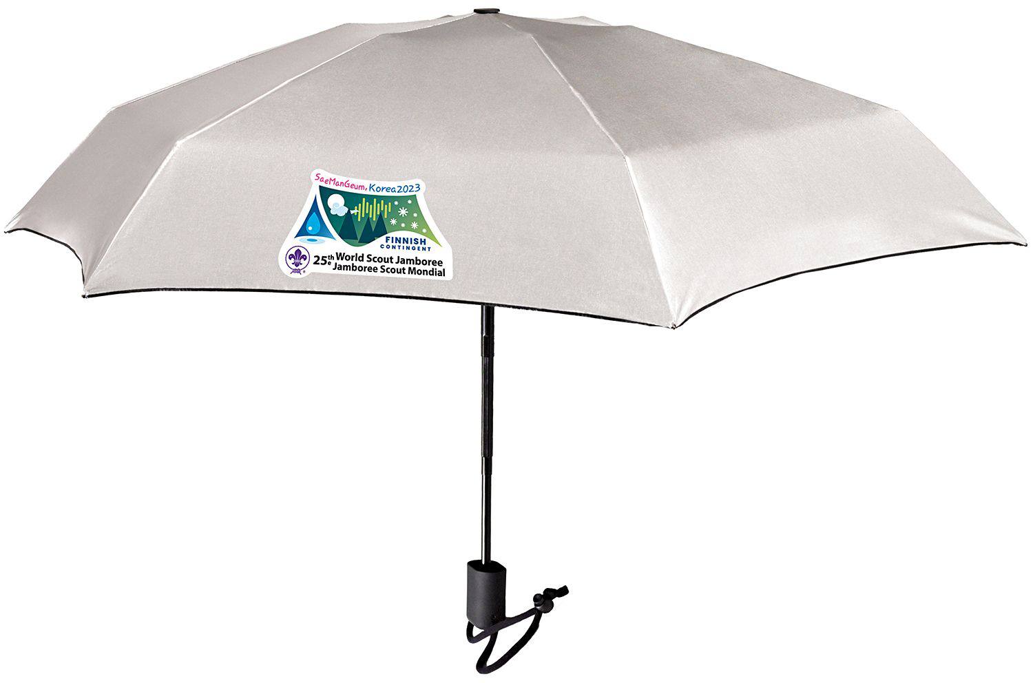 Pieneen pakkautuva sateenvarjo jossa kätevä ikkuna ja kunnollinen heijastinnauha.